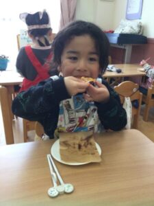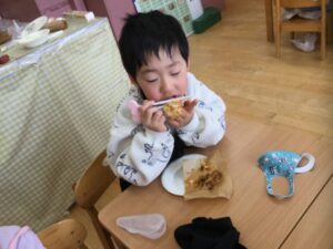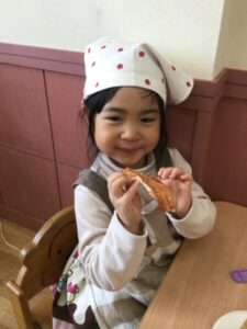実際に食べてみると「モチモチしてるー。」「おいしーい♡」と笑顔がたくさん見られました☺️